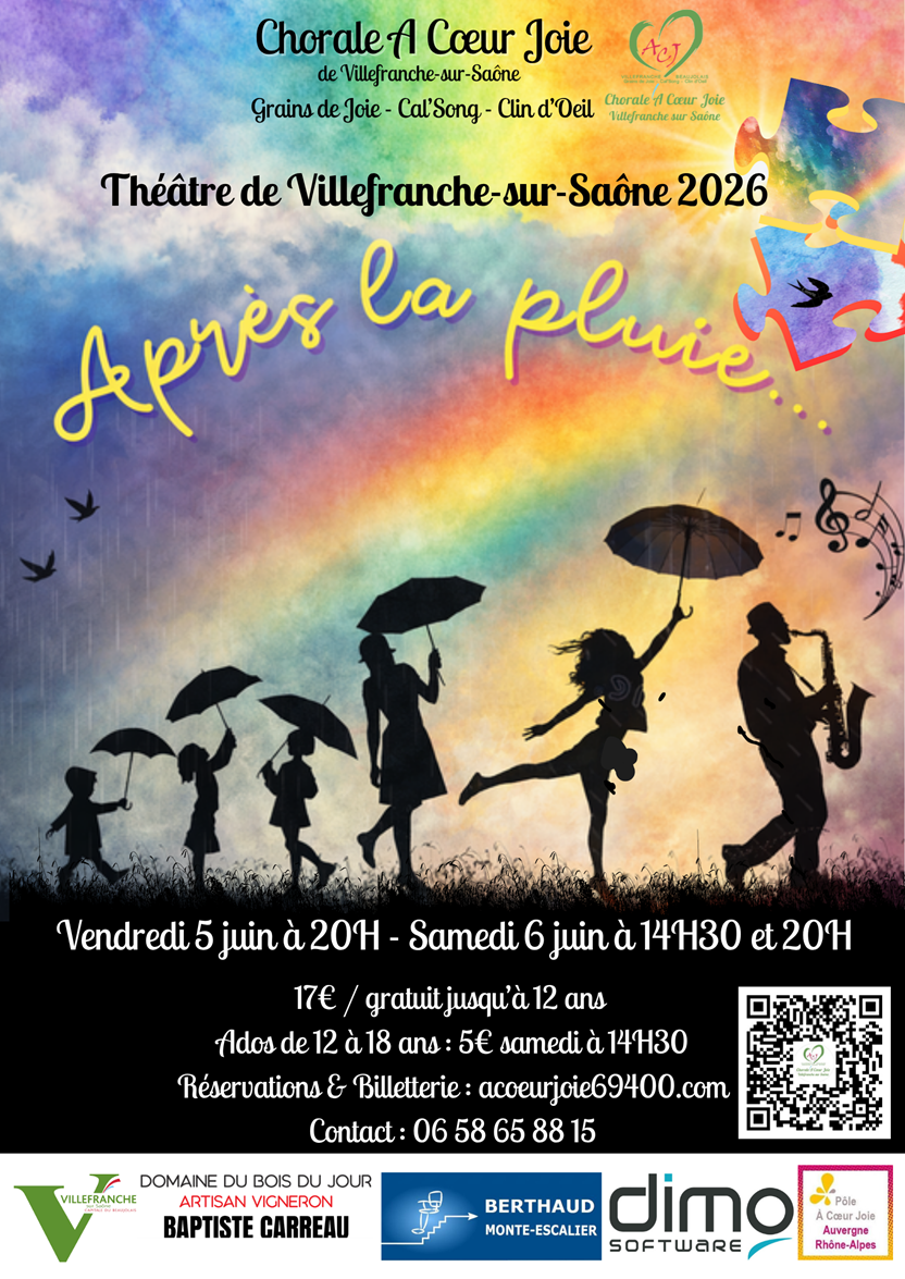 Après la pluie… La Chorale A Coeur Joie de Villefranche a le plaisir de vous annoncer son nouveau spectacle « Après la pluie » qui se tiendra au théâtre de Villefranche : Vendredi 5 juin à 20h et samedi 6 juin à 14h30 et 20h Ce spectacle va permettre à notre Chorale, les enfants […]